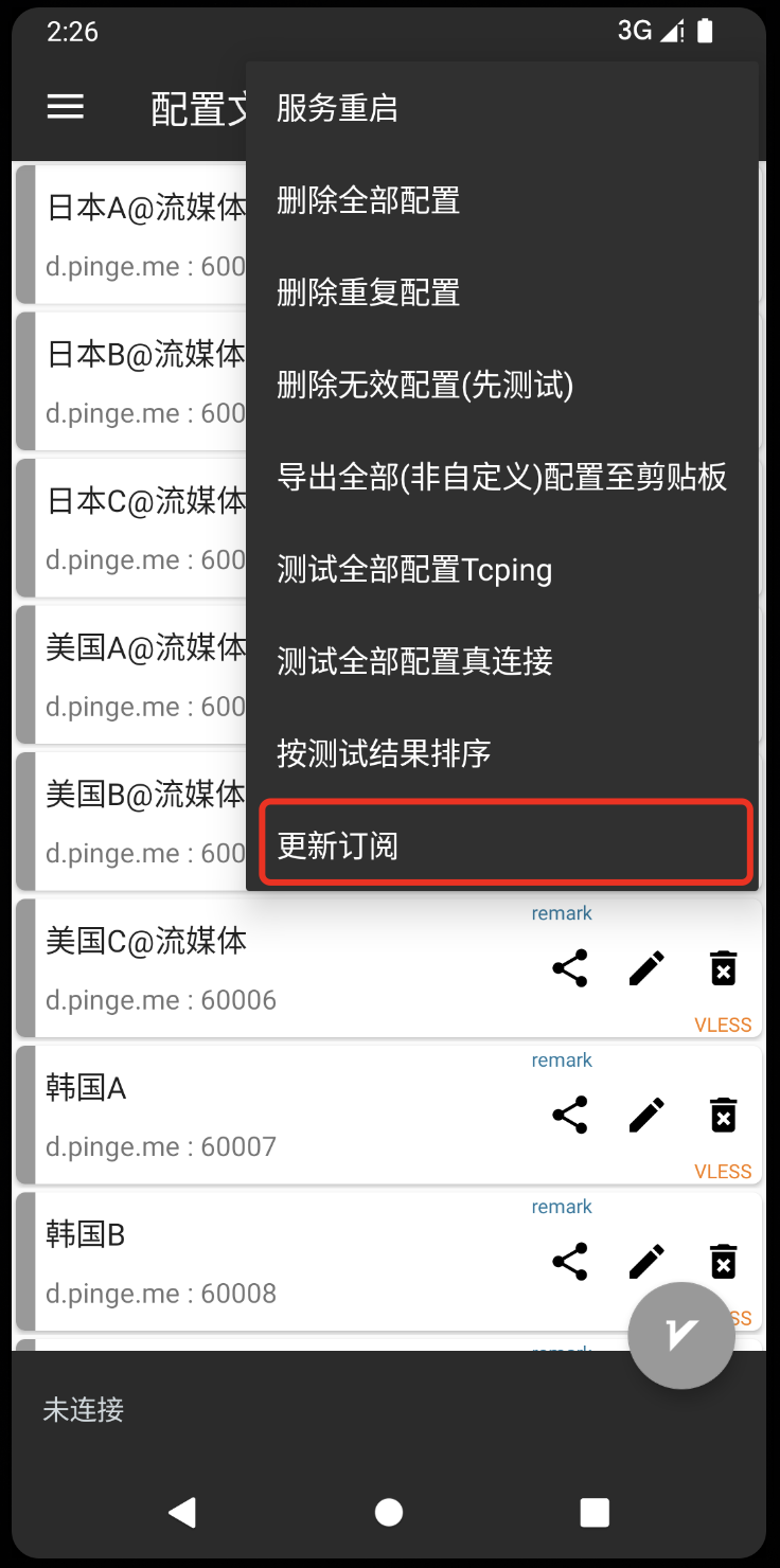 安卓 更新订阅节点,如果提示更新失败也可以删除订阅组重新添加订阅url