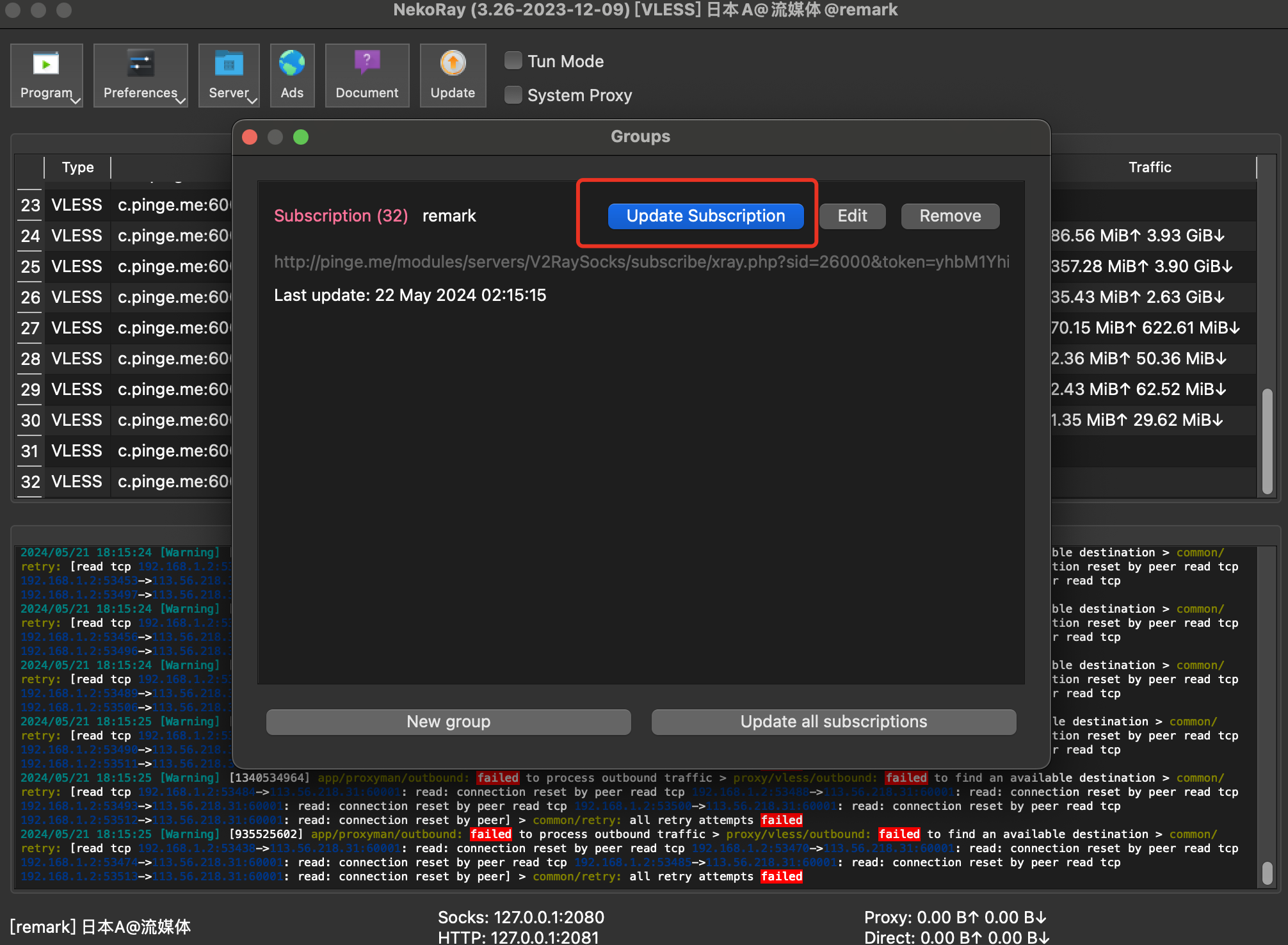macOS & Linux 更新订阅节点,首先将代理状态关闭 [System Proxy]不打钩. ,选择Preferences->Group  再点击[Update Subscription]. 或者Remove订阅组重新导入节点也可以